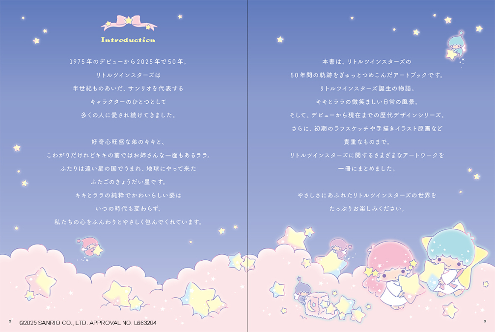 收錄了世界觀、歷代設計以及初期的鉛筆拉夫等珍貴藝術品。從1975年出道到現在,超越時代被人們所喜愛的Little Twin Stars,Kiki&rarara的50年軌跡成為一本書。充滿了初期的鉛筆拉夫、插畫、誕生故事等珍貴的藝術作品。